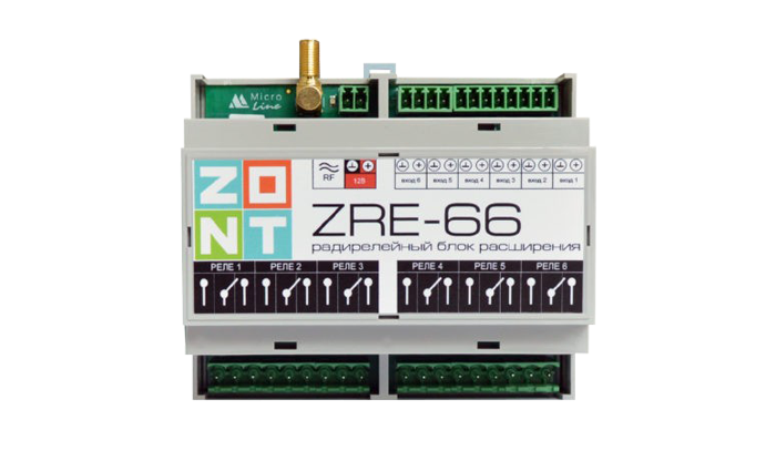 На объектах с многоконтурной системой отопления, где системой автоматизации могут быть охвачены несколько сооружений, для расширения аппаратных возможностей универсальных контроллеров H5000+ PRO.V2, H2000+ PRO.V2, H1000+ PRO.V2, H1500+ PRO и H1500+ PRO.V2 применяется радиорелейный блок расширения ZONT ZRE-66.
