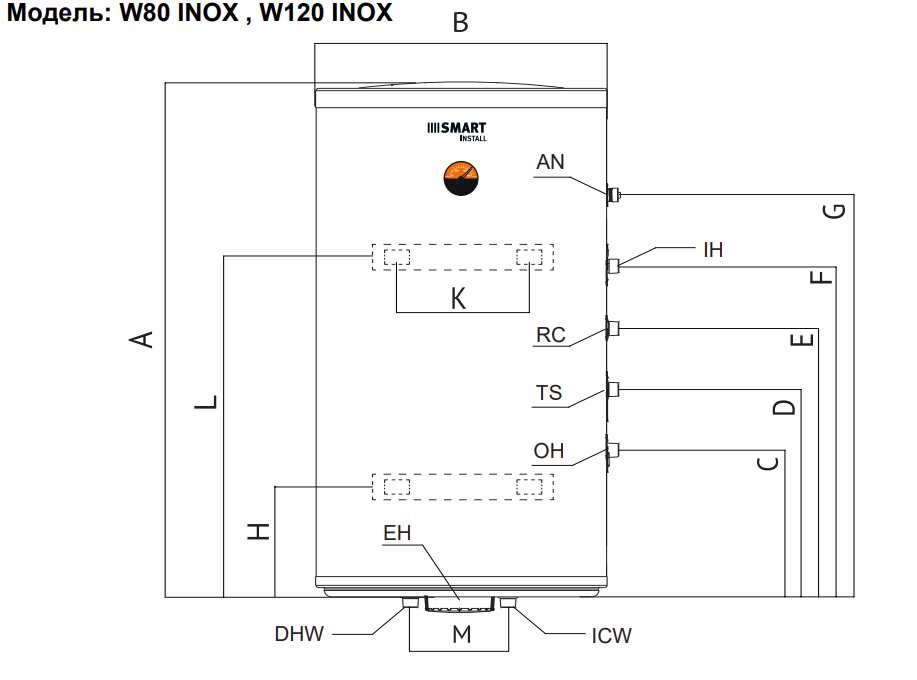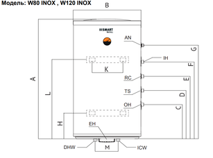 Настенный бойлер косвенного нагрева Smart Install W80 INOX (60001S) объёмом 72 л служит для нагрева бытовой воды с помощью внешнего отопительного котла.