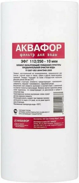 Картридж Аквафор ЭФГ 112/250-10 изготовленный из вспененного полипропилена, предназначен для очистки холодной и горячей воды от песка, грязи, окалины, ржавчины и других нерастворимых примесей.