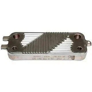 Теплообменник вторичный (87186429490) предназначен для передачи тепла от теплоносителя системы отопления к воде контура горячего водоснабжения. Вторичный теплообменник относится к классу рекуперативных теплообменников и представляет собой аппарат, теплообменная поверхность которых образована набором тонких штампованных металлических пластин с гофрированной поверхностью. Пластины, собранные в единый пакет, образуют между собой каналы, по которым протекают теплоносители, обменивающиеся тепловой энергией. Для обеспечения высокой жаростойкости и придания дополнительных антикоррозийных свойств используется специальное силуминовое покрытие.