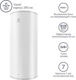 Водонагреватели Electrolux серии Fidelity - на сегодняшний день самые компактные в ассортиментном ряду электрических водонагревателей Electrolux накопительного типа. Приборы диаметром всего 290 мм, разработаны специально для сантехнических ниш и еще большего удобства в монтаже. При своих скромных размерах прибор отличается высокой технологичностью и производительностью. Он идеален для установки в малогабаритных помещениях, а его возможностей хватить для того, чтобы обеспечить горячей водой даже относительно большую семью.